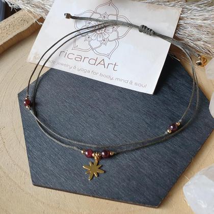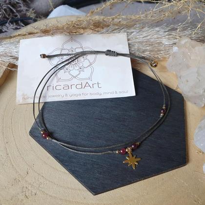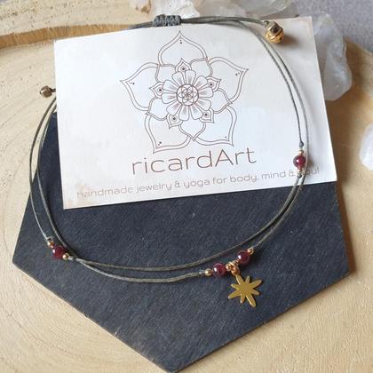Zartes, wasserfestes Fußkettchen mit natürlichen Granatperlen (4mm), 18k vergoldeten Kupferperlen, nickelfreiem Messinganhänger in gold (~13mm) & längenverstellbarem Schiebeverschluss zum individuellen anpassen. Von Hand gefertigt aus gewachstem, sehr strapazierfähigem & wasserfestem Makrameegarn - ideal also für den Sommer & die Badesaison