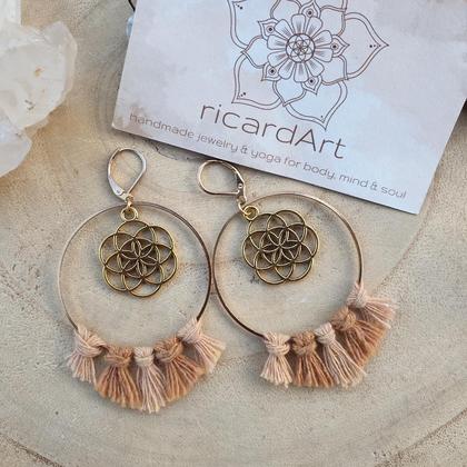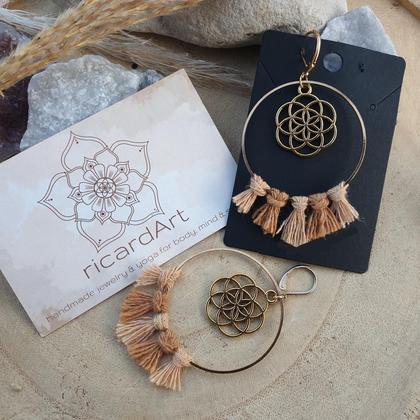 Handgefertigte Makramee Ohrringe mit vergoldeten Messingreifen (45mm Durchmesser), umknüpft mit Makrameegarn aus 100%iger Baumwolle & 20mm Anhänger der Saat des Lebens. Als Ohrhaken habe ich geschlossene Brisuren aus Edelstahl verwendet (nickel-& bleifrei), welche auch für sensible Ohren geeignet sind *du bekommst deine Ohrringe hübsch verpackt in einer handbedruckten Box aus recyceltem Altpapier