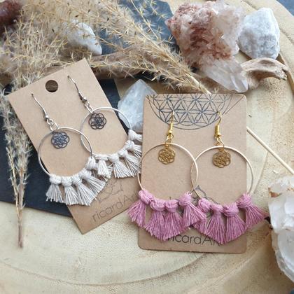 Von Hand gefertigte Ohrschätze im Boho-Stil, umknüpft mit naturfarbenerm Makrameegarn, mit Ohrhaken aus 925 Sterlingsilber & 11mm Messinganhänger der Saat des Lebens in gold oder silber Durchmesser Messing-Hoops: 30mm *Die Makrameefransen können bei Bedarf mit einem Kamm wieder in Form gebracht werden