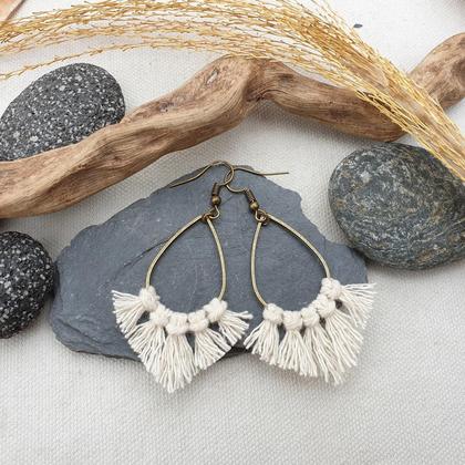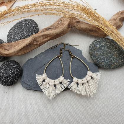 Hübsche Makramee- Ohrschätze in bronze im Bohemian - Stil - mit 100%iger Baumwolle beknüpft. Die Ohrhaken sind aus bronzefarbenem Edelstahl Gesamtlänge ~ 55mm (die Fransen können bei Bedarf mit einem Kamm wieder in Form gebracht werden :)
