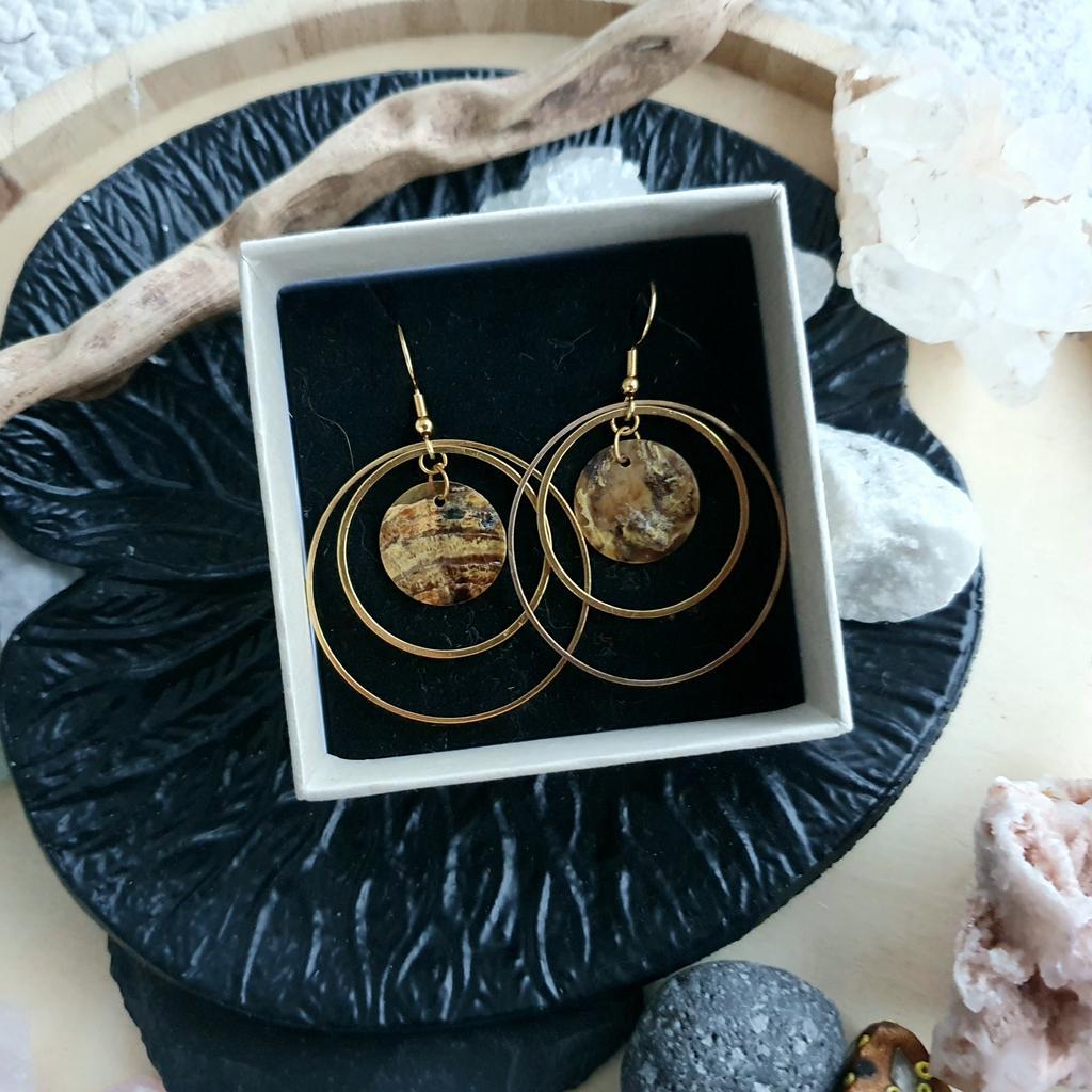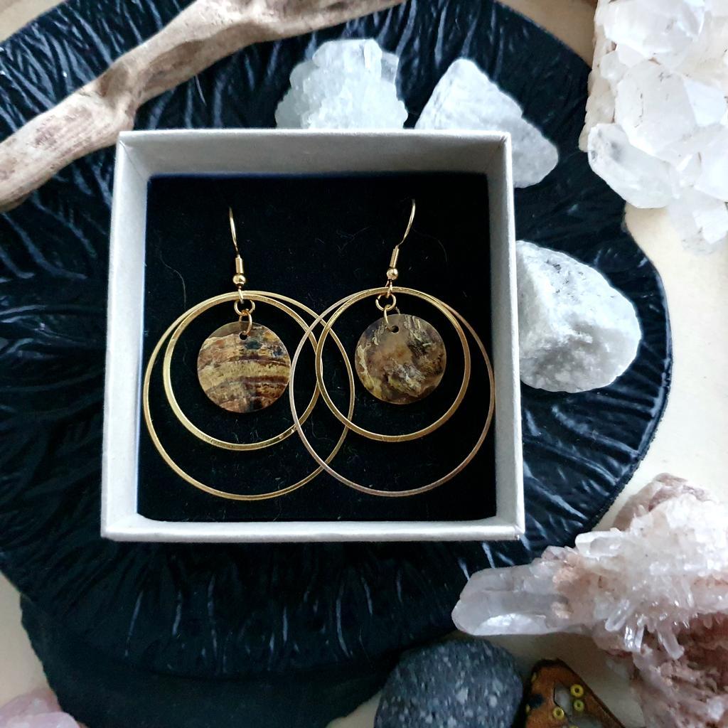 Messinghoops mit 40mm äußerem Durchmesser kombiniert mit gefärbten Muschelplättchen mit einzigartigen Farbstrukturen. Die Ohrhaken aus Messing sind nickelfrei & somit auch für sensible Ohren geeignet. *du bekommst deine Ohrringe hübsch verpackt in einer handbedruckten Box aus recyceltem Altpapier