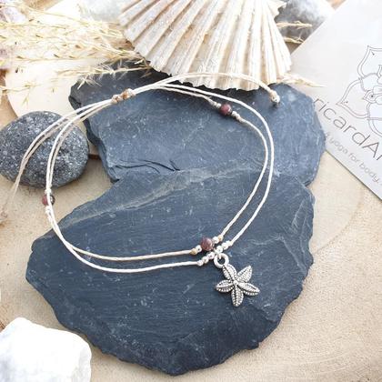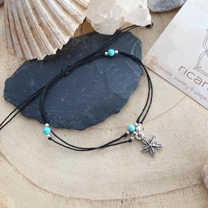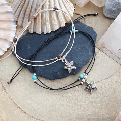 Zartes, doppelreihiges Fußband aus wasserfestem Makrameegarn (gewachst & strapazierfähig), mit natürlichen Edelsteinen (4-6mm) & nickelfreiem Seesternanhänger in antikem silber mit 13x16mm. Dank ängenverstellbarem Schiebeverschluss lässt sich jedes Fußband individuell anpassen. *du bekommst dein Schmuckstück hübsch verpackt in einem handbedruckten Naturleinenbeutel, mit persönlichem Steckbrief beigelegt auf dem du die wichtigsten Infos zu deinem neuen Begleiter nachlesen kannst TÜRKIS (Halschakra/ Viśuddha) Kreativität ~ Lebensfreude/ Lebenskraft ~ Selbstbewusstsein ~ Kommunikation RHODONIT (Wurzelchakra/ Mūlãdhãra) Vergebung ~ Loslassen ~  Neubeginn ~ Erste Hilfe Stein~