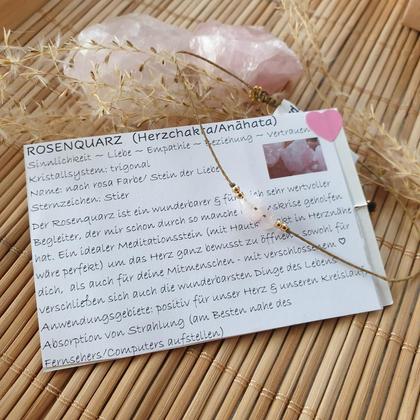 Zartes Rosenquarzarmband auf Schmuckärtchen aus recyceltem Altpapier. Das Armband aus strapazierfähigem Makrameegarn ist wasserfest & mit längenverstellbarem Schiebeverschluss zum individuellen anpassen von Hand gefertigt. Mit 18k vergoldeten Messingperlen Rosenquarz ins unregelmäßiger Splitterform *Du bekommst dein Schmuckstück in einem handbedruckten Naturleinenbeutel verpackt & mit persönlichem Steckbrief beigelegt auf dem du die wichtigsten Infos zu deinem neuen Begleiter nachlesen kannst ROSENQUARZ (Herzchakra/Anãhata) Sinnlichkeit ~ Liebe ~ Empathie ~ Beziehung ~ Vertrauen Der Rosenquarz ist ein wunderbarer & für mich sehr wertvoller Begleiter, der mir schon durch so manche Herzenskrise geholfen hat. Ein idealer Meditationsstein (mit Hautkontakt in Herznähe wäre perfekt) um das Herz ganz bewusst zu öffnen - sowohl für dich, als auch für deine Mitmenschen - mit verschlossenem ♡ verschließen sich auch die wunderbarsten Dinge des Lebens Anwendungsgebiete: positiv für unser Herz & unseren Kreislauf, Absorption von Strahlung (am Besten nahe des Fernsehers/Computers aufstellen) Sternzeichen: Stier