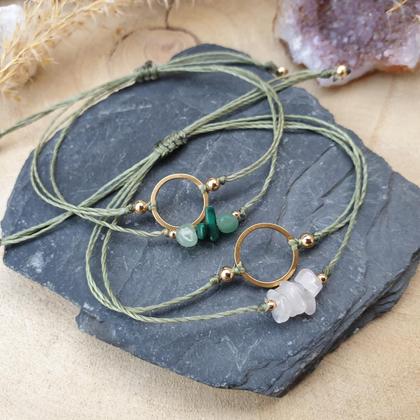 Zarte Edelsteinarmbänder mit natürlichem Rosenquarz ODER Malachit & Aventurin in unregelmäßiger, ungeschliffener Splitterform (jedes Stück wird so zu einem Unikat). Von Hand gefertigt aus wasserfestem Makrameegarn (gewachst & strapazierfähig), mit 18k vergoldetem Edelstahlverbinder (12mm Durchmesser), 18k vergoldeten Kupferperlen (2mm), sowie längenverstellbarem Schiebeverschluss zum individuellen anpassen *Du bekommst dein Armband hübsch verpackt in einem handbedruckten Naturleinenbeutel, mit persönlichem Steckbrief beigelegt aufdem du die wichtigsten Infos zu deinem neuen Begleiter nachlesen kannst Ein wunderbarer Wegblegleiter für jeden Tag