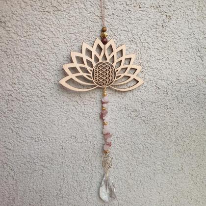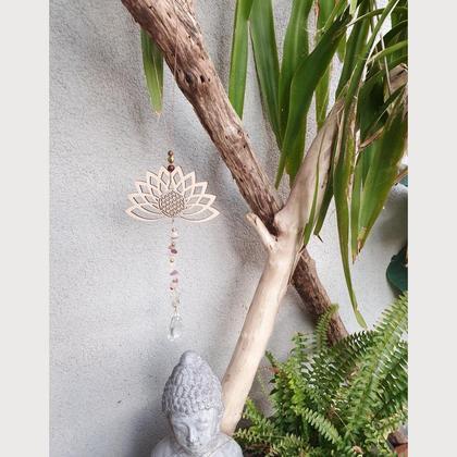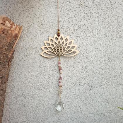 Hol dir Licht & Harmonie ins Haus!!! Der Sonnenfänger liebt es besonders vor Fenstern zu hängen. Laut Fengh Shui soll so verhindert werden, dass positive Energien zu schnell aus den Fenstern strömen. Die Lotusblüte ( Symbol für Weiblichkeit, Weisheit & Reinheit) ist aus Holz (14×7cm), mit eingravierter Lebensblume. Bestückt ist der hübsche Harmoniebringer mit natürlichen Rosenquarz-& Erdbeerquarzperlen, sowie facettierten Prismaglaskristallen zur Aufspaltung & Reflexion des Sonnenlichts ♡ Fällt Licht auf einen Kristall, so zeigt sich das wunderbare Farbenspektrum des Regenbogens ♡ Bringt Harmonie an jeden Ort deiner Wahl Gesamtlänge ca. 17cm
