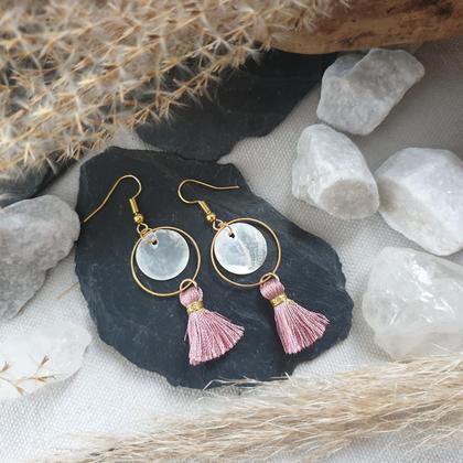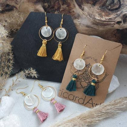 Von Hand gefertigte Ohrschätze mit 18k vergoldeten Edelstahlohrhaken, 3cm Tasseln & 12mm Muschel-Plättchen in 20mm Edelstahl-Hoop (vergoldet) Gesamtlänge (ohne Ohrhaken): ~50mm