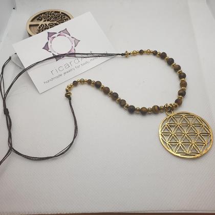 Tigerauge Halskette ‚Blume des Lebens‘ antikgold