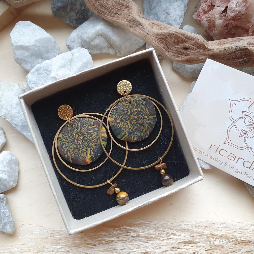 Individueller Ohrschmuck mit handgefertigten FIMO Applikationen in kräftigen Farbdesigns (jedes Paar wird aufgrund des individuellen Farbverlaufs zu einem Unikat). Bestückt mit natürlichem Tigerauge & Messinghoops mit 40mm äußererm Durchmesser. Die verwendeten Ohrstecker sind aus hochwertig vergoldetem Edelstahl & nickelfrei. *du bekommst deine Ohrringe hübsch verpackt in einer handbedruckten Box aus recyceltem Altpapier, mit persönlichem Steckbrief beigelegt auf dem du die wichtigsten Infos zu deinem neuen Begleiter nachlesen kannst TIGERAUGE (Solarplexuschakra/ Manipūra) Mut ~ Durchblick ~ Optimismus - Entschlossenheit- Der 'Entscheidungs-Stein' - Mit ihm fällt es dir leichter klare Entscheidungen zu treffen. Das Tigerauge schafft 'Ordnung im Chaos'. In unüberschaubaren Situationen und wenn du dir einmal unsicher bist, unterstützt es dabei den Durchblick zu bewahren & den Fokus zu schärfen. Als Talisman ein wunderbarer Wegbegleiter auf Reisen und unterwegs