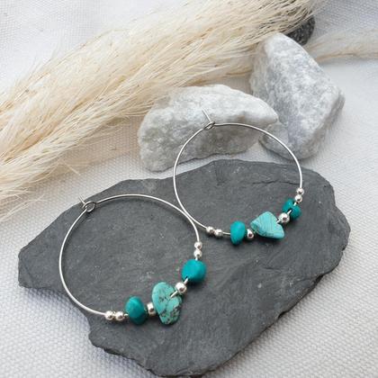 Kraftvolle Edelsteincreolen mit natürlichem Türkis in seiner wunderschönen & einzigartigen Rohform ♡ Die Creolen sind hergestellt aus hochwertigem, (vergoldetem) Edelstahl und haben einen Durchmesser von 30mm. Aufgrund der Einzigartigkeit der einzelnen Edelsteine wird auch jedes Schmuckstück zu einem Unikat & somit einzigartig - so einzigartig wie du ♡