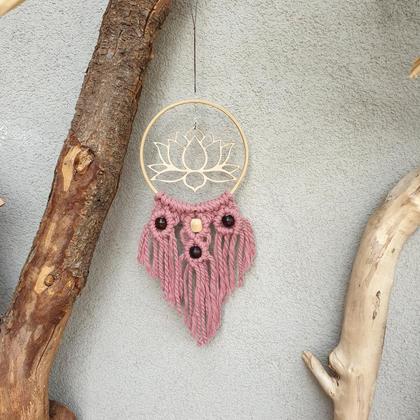 Handgefertigtes Makrameedesign 12cm Holzreifen (Bambus) umknüpft mit Makrameegarn aus recycelter Baumwolle (OEKOTEX), bestückt mit Holzperlen & einem facettierten Prismaglaskristall --> "Sonnenfänger-Effekt": Fällt Licht auf ein Prisma/ einen Prismakristall, so wird es gespalten & in den wunderschönen Farben des Regenbogens (Spektralfarben) auf deinen Wänden & auf umgebenden Flächen reflektiert Gesamtlänge (ohne Aufhängun): ~27cm