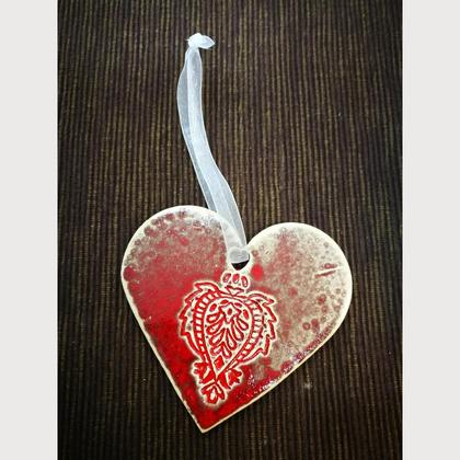 Anhänger in Herzform aus Keramik, beidseitig glasiert und bei 1050 ° gebrannt. 11 cm groß, jedes Muster ist individuell und mit dem Glasurverlauf einzigartig.