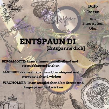 Duftkerze "Entspaun di" im 120ml Braunglas mit Deckel. Die Kerze besteht aus pflanzlichem Raps-und Kokoswachs, einem Baumwolldocht, sowie ätherischen Ölen. Brenndauer ca. 30+Stunden. Vegan und paraffinfrei. Der Duft besteht aus folgenden Komponenten: Lavendel-krautig, frisch, wirkt beruhigend und entspannend Bergamotte-zitrisch, hebt die Stimmung Wacholder- holzig, frisch, stärkt die Nerven Der ideale Duft, um nach einem anstrengenden Tag gemütlich daheim zu entspannen! Handgemacht in Österreich aus natürlichen Rohstoffen. Nachhaltig und umweltfreundlich. Ein paar Hinweise zum richtigen Umgang mit meinen Kerzen: -beim ersten Abbrennen das Wachs bis zum Rand schmelzen lassen, damit die Kerze auch später gut abbrennt -optimale Brenndauer zwischen 1 und 4 Stunden -Docht regelmäßig kürzen -Zugluft vermeiden -Kerze nie unbeaufsichtigt brennen lassen -Achtung! Glas wird heiß, daher am besten auf eine nicht brennbare Unterlage stellen. -ätherische Öle und Duftöle können allergische Reaktionen hervorrufen, bitte vorher informieren! Aufgrund der natürlichen Rohstoffe kann die Kerze an der Oberfläche nach dem Abbrennen Dellen, kleine Löcher etc aufweisen. Dies mindert die Qualität der Kerze in keinem Fall, im Gegenteil, es zeigt, dass auf schädliche Zusätze verzichtet wurde.