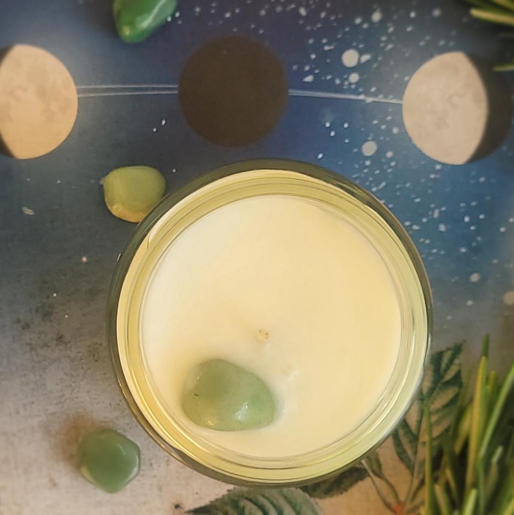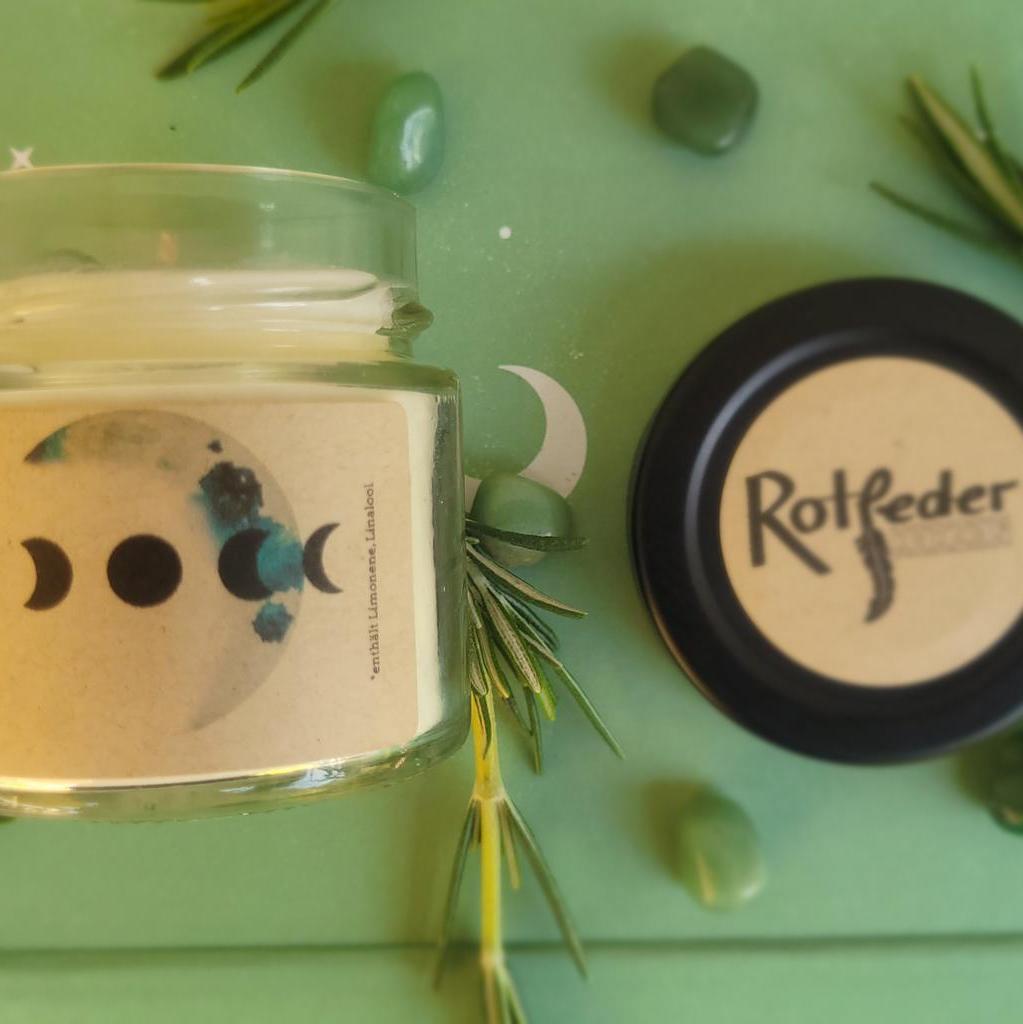 Duftkerze "Neimond" im 125ml Glas mit silbernem Deckel. Die Kerze besteht aus pflanzlichem Rapswachs, einem Baumwolldocht, sowie ätherischem Zypressen- und Lavendelöl. Nicht nur der Vollmond, auch der Neumond kann uns beeinflussen: er symbolisiert Neubeginn, steht für Veränderungen und hilft uns, Neues willkommen zu heissen. Die ätherischen Öle von Zypresse und Rosmarin stehen dir dabei zur Seite mit ihrer klärenden, stärkenden Wirkung. Du kannst die Kerze auch für ein kleines Neumondritual verwenden: Nimm dir Zeit für dich, zünde die Duftkerze an, atme tief durch und überleg dir, welche Wünsche du zu Neumond hast- schreib sie auf, und visualisiere deine positiven Wünsche so, als ob sie schon in Erfüllung gegangen sind. Der Trommelstein aus Aventurin, der als Deko mit drauf ist, hilft dir, dich von Altlasten zu befreien und deine eigene Träume besser wahrzunehmen, und kann nach dem Abbrennen der Kerze natürlich weiterverwendet werden. Brenndauer ca. 25+ Stunden. Vegan und paraffinfrei. Handgemacht in Österreich aus natürlichen Rohstoffen. Nachhaltig und umweltfreundlich. Der Duft besteht aus folgenden Komponenten: Zypresse: holzig, frisch, stärkend, konzentrationsfördernd Rosmarin: würzig, frisch, kampferartig, nervenstärkend, schenkt Klarheit Ein paar Hinweise zum richtigen Umgang mit meinen Kerzen: -beim ersten Abbrennen das Wachs bis zum Rand schmelzen lassen, damit die Kerze auch später gut abbrennt -optimale Brenndauer zwischen 1 und 4 Stunden -Docht regelmäßig kürzen -Zugluft vermeiden -Kerze nie unbeaufsichtigt brennen lassen -Achtung! Glas wird heiß, daher am besten auf eine nicht brennbare Unterlage stellen. -ätherische Öle und Duftöle können allergische Reaktionen hervorrufen, bitte vorher informieren! Aufgrund der natürlichen Rohstoffe kann die Kerze an der Oberfläche nach dem Abbrennen Dellen, kleine Löcher etc aufweisen. Dies mindert die Qualität der Kerze in keinem Fall, im Gegenteil, es zeigt, dass auf schädliche Zusätze verzichtet wurde.