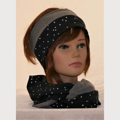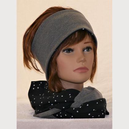 Stirnband und Loop (für Erwachsene) aus Baumwolljersey (95%Baumwoller, 5%Elasthan) Stirnbandbreite ca. 10cm eine Seite gemustert, eine Seite grau uni One Size, auf 30 Grad waschbar