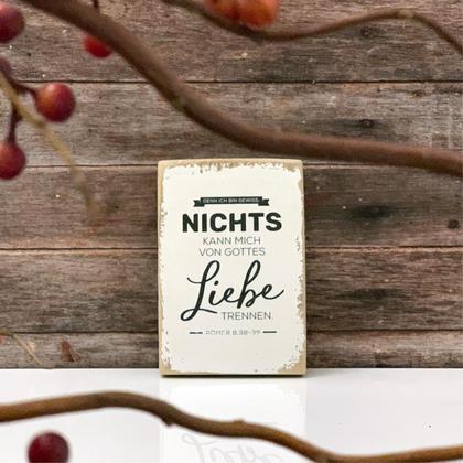 Größe ca. 8x12 cm groß. Text: Denn ich bin gewiss: Nichts kann mich von Gottes Liebe trennen. Römer 8,38-39 Jedes handverarbeitete Holzschild wird in Wien aus Altholz hergestellt und ist ein Unikat. Das Foto ist ein Symbolbild. In ähnlicher Weise wird das Schild weiß bemalt und der Text mittels spezieller Technik übertragen. Grundsätzlich ist natürlich jedes andere Maß auch zu bestellen. Preis und Lieferzeit auf Anfrage. Die Auswahl an Textbotschaften wird laufend erweitert. Ideal als Geschenk oder zum Selbstbehalten.