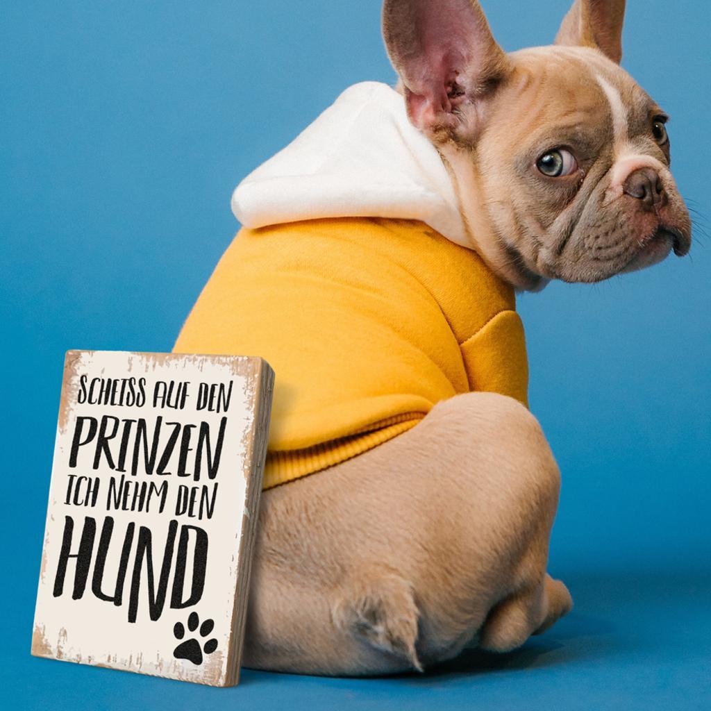 Größe ca. 10x15 cm groß. Text: Scheiss auf den Prinzen. Ich nehm den Hund. Jedes handverarbeitete Holzschild wird in Wien aus Altholz hergestellt und ist ein Unikat. Das Foto ist ein Symbolbild. In ähnlicher Weise wird das Schild weiß bemalt und der Text mittels spezieller Technik übertragen. Grundsätzlich ist natürlich jedes andere Maß auch zu bestellen. Preis und Lieferzeit auf Anfrage. Die Auswahl an Textbotschaften wird laufend erweitert. Ideal als Geschenk oder zum Selbstbehalten.