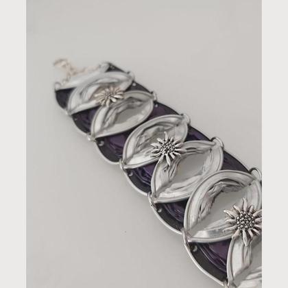 upcycling ... wenn aus Altem Neues wird Dieses wunderschöne Trachtenarmband wurde aus insgesamt 9 violetten gereinigten Kaffeekapseln gefertigt und mit 4 silberfarbenen Edelweissen verziert. Die Rückseite (= Filterseite der Kapsel) dieses dekorativen Armbandes wurde silber lackiert. Das Armband ist sehr leicht, ein absoluter Hingucker und wertet jedes Dirndl oder Trachtenoutfit auf. Größe / Maße / Gewicht: Länge : ca. 20 cm Breite: 35 mm Material: gereinigte Kaffeekapseln aus Aluminium Verschluss: Karabiner alle Metallteile: Zink-Legierung, nickelfrei Gewicht: 15 g ****** Die farbliche Darstellung des Artikels kann je nach dem von Ihnen verwendeten Internetbrowser und der Monitoreinstellung geringfügig variieren. Diese Abweichungen sind technisch nie ganz vermeidbar.