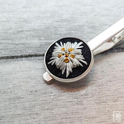 silberne Krawattennadel mit Edelweiss, handgestickt mit echter Seide