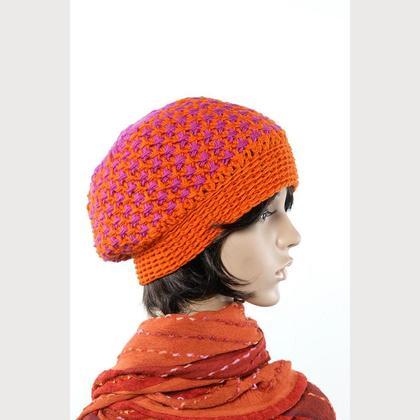 Hangestrickte Haube aus feinster, reiner (Merino-) Schurwolle - Hahnentritt-Muster in pink/orange