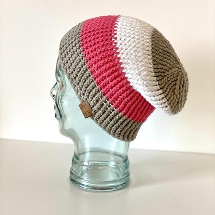 Die Häkelmütze in rosa, weiß und beige wurde von der ersten Masche bis zum Annähen des Etiketts in liebevoller Handarbeit gefertigt.