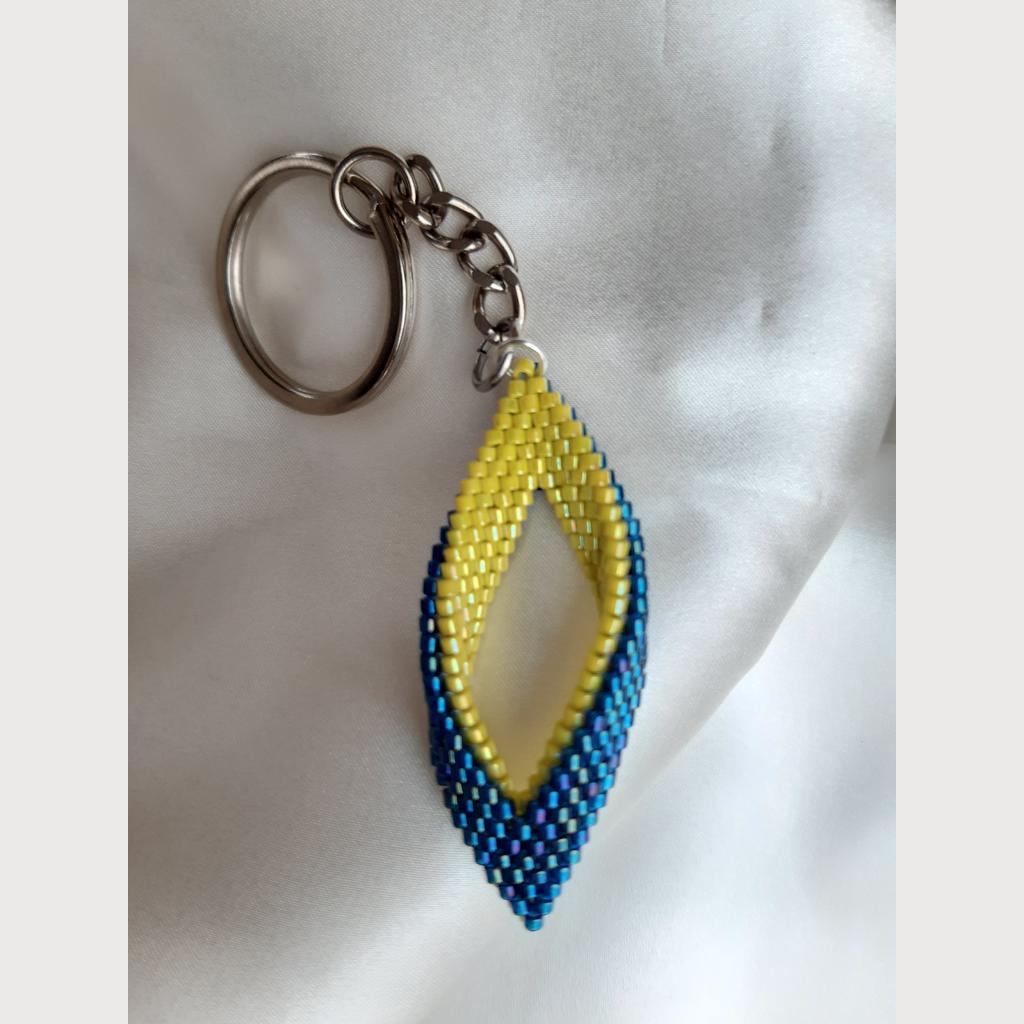 Diese wunderschöne, aufwendige Handarbeit in der Peyote-Technik gefädelt und mit hochwertigen Materialien verarbeitet (Miyuki-Delica-Perlen in schönem reifen Zitronengelb mit Regenbogen-Glanzbeschichtung und Petrolblau mit verspielten Farbnuancen), wandelt diesen ca 10x2 cm langen Schlüsselanhänger in ein ausdrucksvolles Accessoire um.
