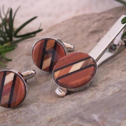 Zum ShopSet Krawattennadel und Manschettenknöpfe aus 6 Holzarten