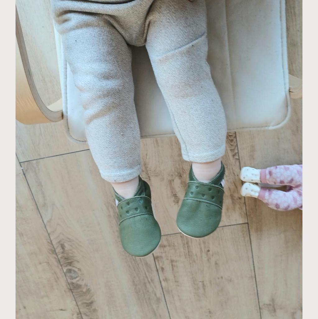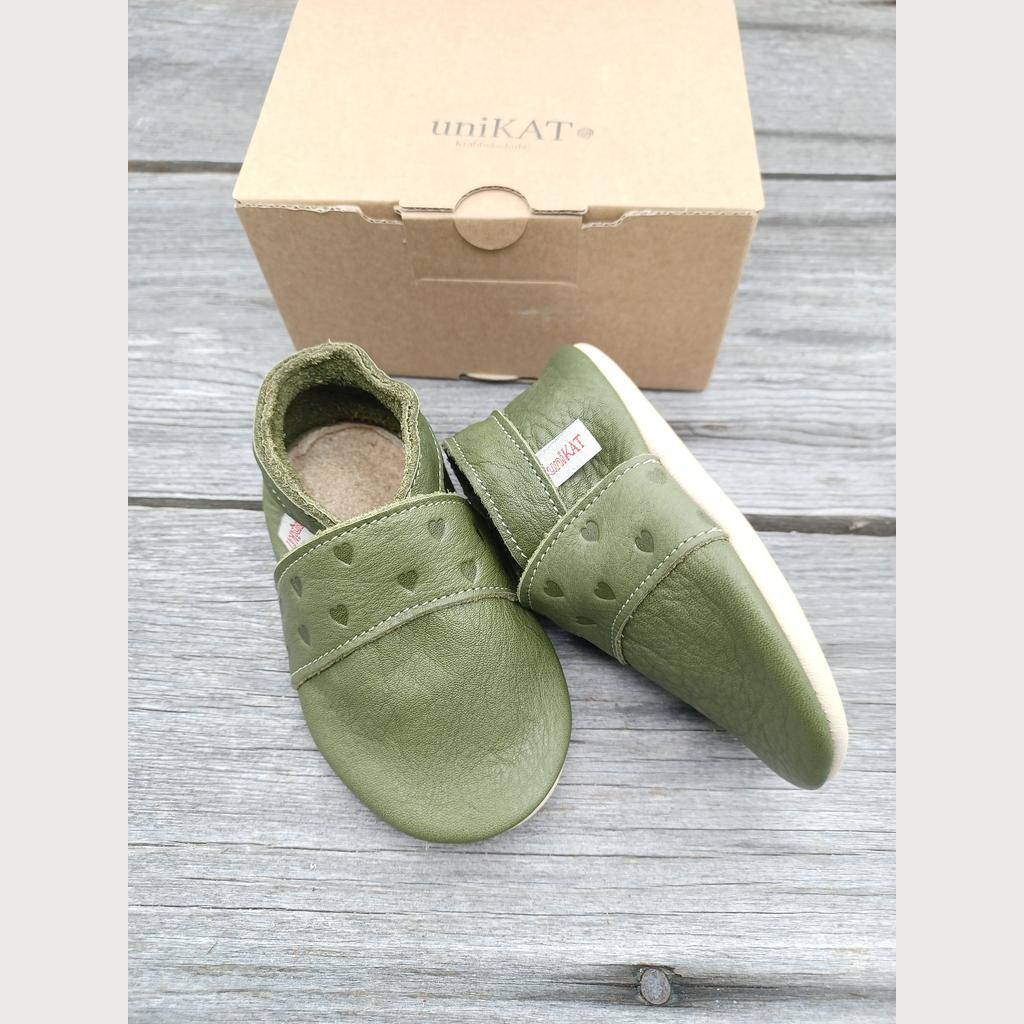 Krabbelschuhe Naturleder, khaki mit Herzen Gr 18/19