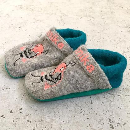 Bequeme, weiche Patschen aus Wollwalk (100% Wolle) mit Ledersohle! Süße, gestickte Biene, auf Wunsch kann auch der Name aufgestickt werden (siehe Beispiel am Foto - neonpink), in den Größen 18-30.