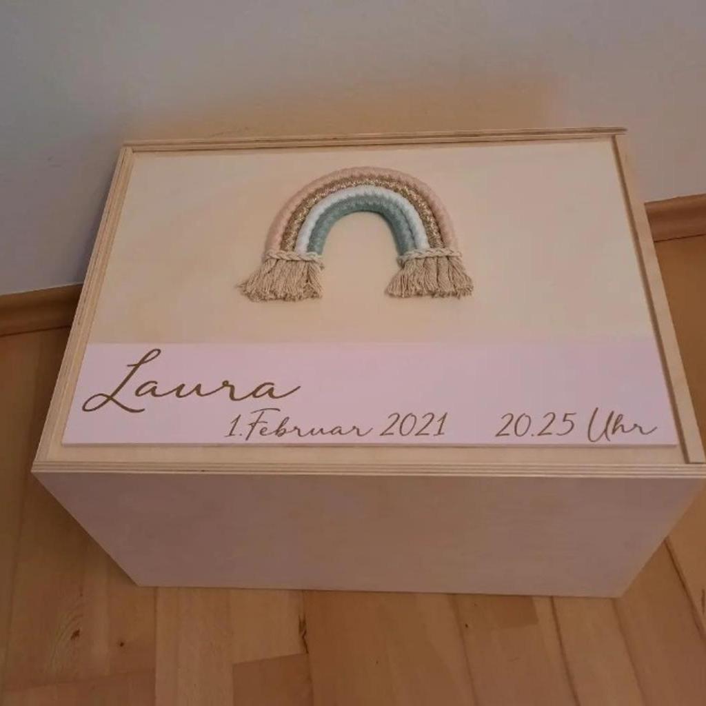 Für die Individualisierung deiner Kiste kontaktiere mich bitte und wir besprechen alle Details wie Text, Farben des Regenbogens und des Holzschildes.