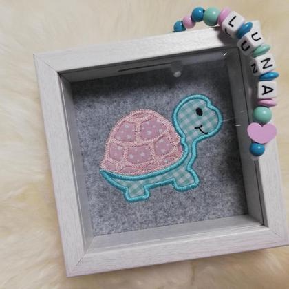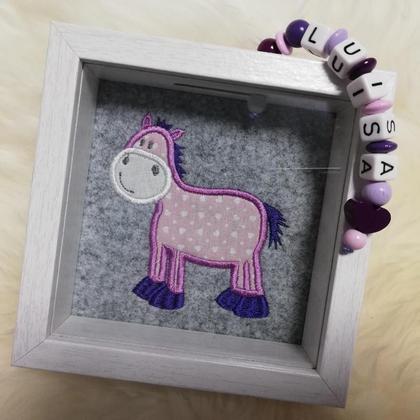 Der Stick mit Applikation an der Innenseite kann individuell (Tier, Farbe) ausgesucht werden. Dazu kommt noch ein Namenskettchen, wahlweise mit Herz oder Stern.
