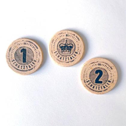 Das Set besteht aus 14 Schatztaler-Münzen aus Buchenholz, jeweils 7x 1-Schatztaler-Münzen und 7x 2-Schatztaler-Münzen.