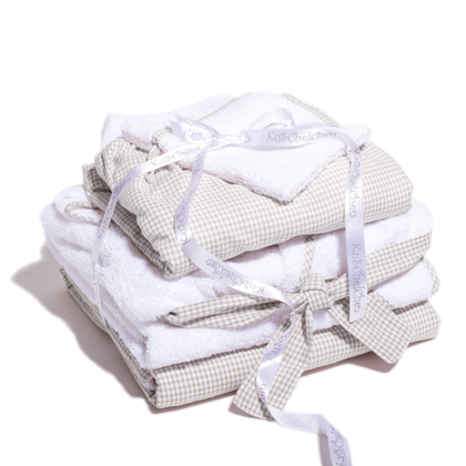 Unser Erstlingspaket besteht aus einer Kuscheldecke 80x80, einem kuscheligen Strampelsack 40 cm, einem Kapuzenbadetuch 80x80, einem Waschhandschuh und einem Bademantel Gr.80