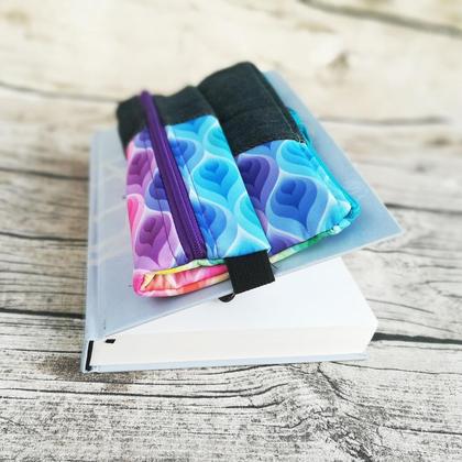 Je nachdem, wofür das hintere größere Fach gedacht ist, kann es entweder mit etwas Abwischbarem (für Alltagsmaske) oder Weichem (Brille) gefüttert werden. Mittels Gummi kann das Doppel-Pennal um einen Block oder einen Ordner geklemmt werden, so hat man es immer dabei.