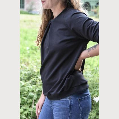 Anouk macht auf schick, ist aber aus bequemem Bio Sweatstoff und dadurch herrlich angenehm und unkompliziert zu tragen. Die Kellerfalte vorne gibt Bewegungsfreiheit und guten Sitz. Mit 3/4 Ärmeln und Bündchenabschluss.