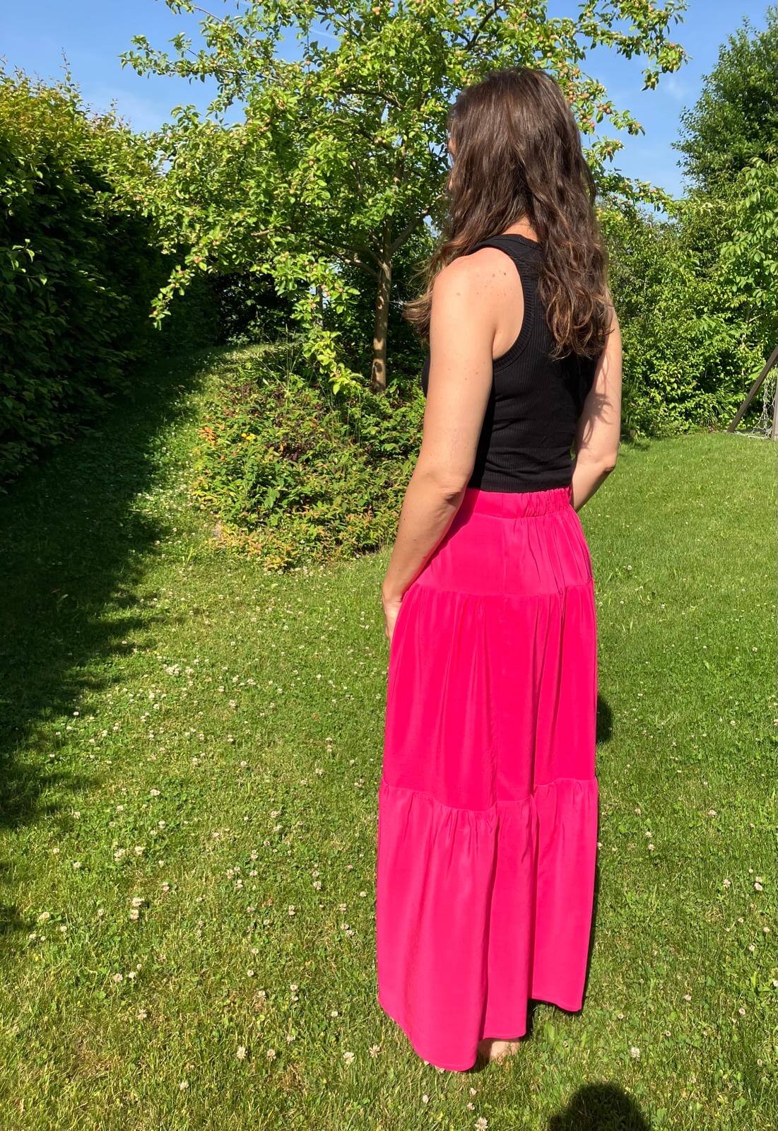 Der lange Stufenrock ist ein Meisterwerk der Handarbeit. Die Seide sorgt für einen angenehmen Tragekomfort und eine einzigartige Optik. Der Rock ist vielseitig und kann für verschiedene Anlässe getragen werden.
