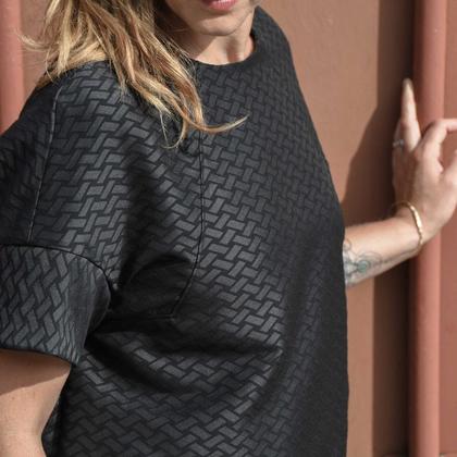 Der wunderschöne Stoff mit Ton-in-Ton-Muster wurde in Österreich produziert, genäht wird Ruth wie alles bei Elisia von mir in St. Pölten. Der Schnitt ist geradlinig, mit spannenden Ziernähten an den kurzen Ärmeln. Ein Statement-Top in rot-weiß-rot… nein schwarz.