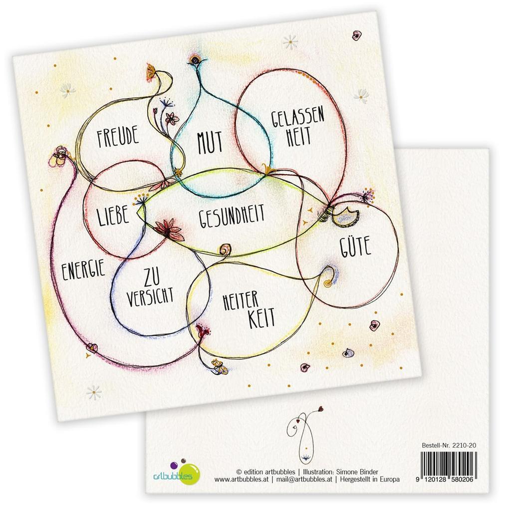 Auf dieser Karte findest Du die Worte „Freude, Mut, Gelassenheit, Liebe, Gesundheit, Energie, Zuversicht, Heiterkeit, Güte“. Alles, was man einem lieben Menschen wünschen kann, damit er wieder in Schwung kommt … Oder für einen selbst, um die Karte auf den Kühlschrank zu pinnen.