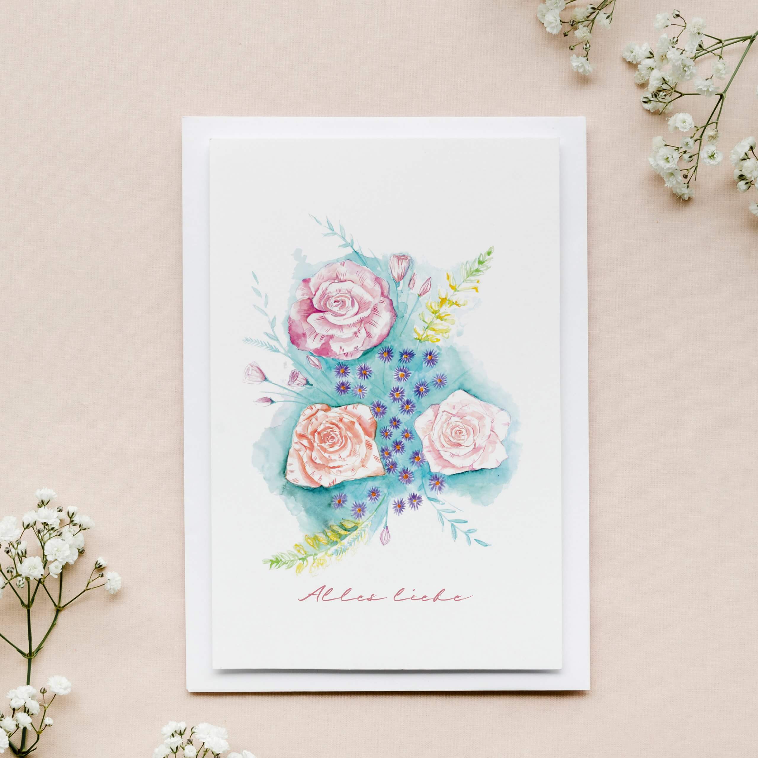 Zarte Grußkarte Rosenstrauß „Alle Liebe“
