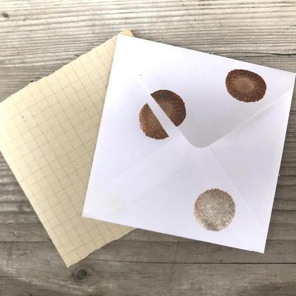 handbedruckt mit großen Punkten in Farbe Gold/Bronze, innen drinnen ist ein 3 mal gefaltetes Vintage Papier/Karo um ein paar nette Worte zu schreiben.