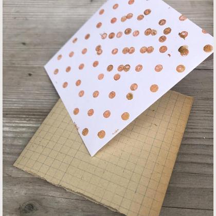 handbedruckt mit kleinen Punkten in Farbe Gold, innen drinnen ist ein 3 mal gefaltetes Vintage Papier/Karo um ein paar nette Worte zu schreiben.