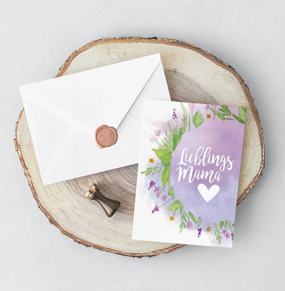 Ob zum Geburtstag oder einfach so: Diese Grußkarte ist ein Druck meiner handgemalten Aquarell-Illustration mit der Aufschrift „Lieblingsmama"