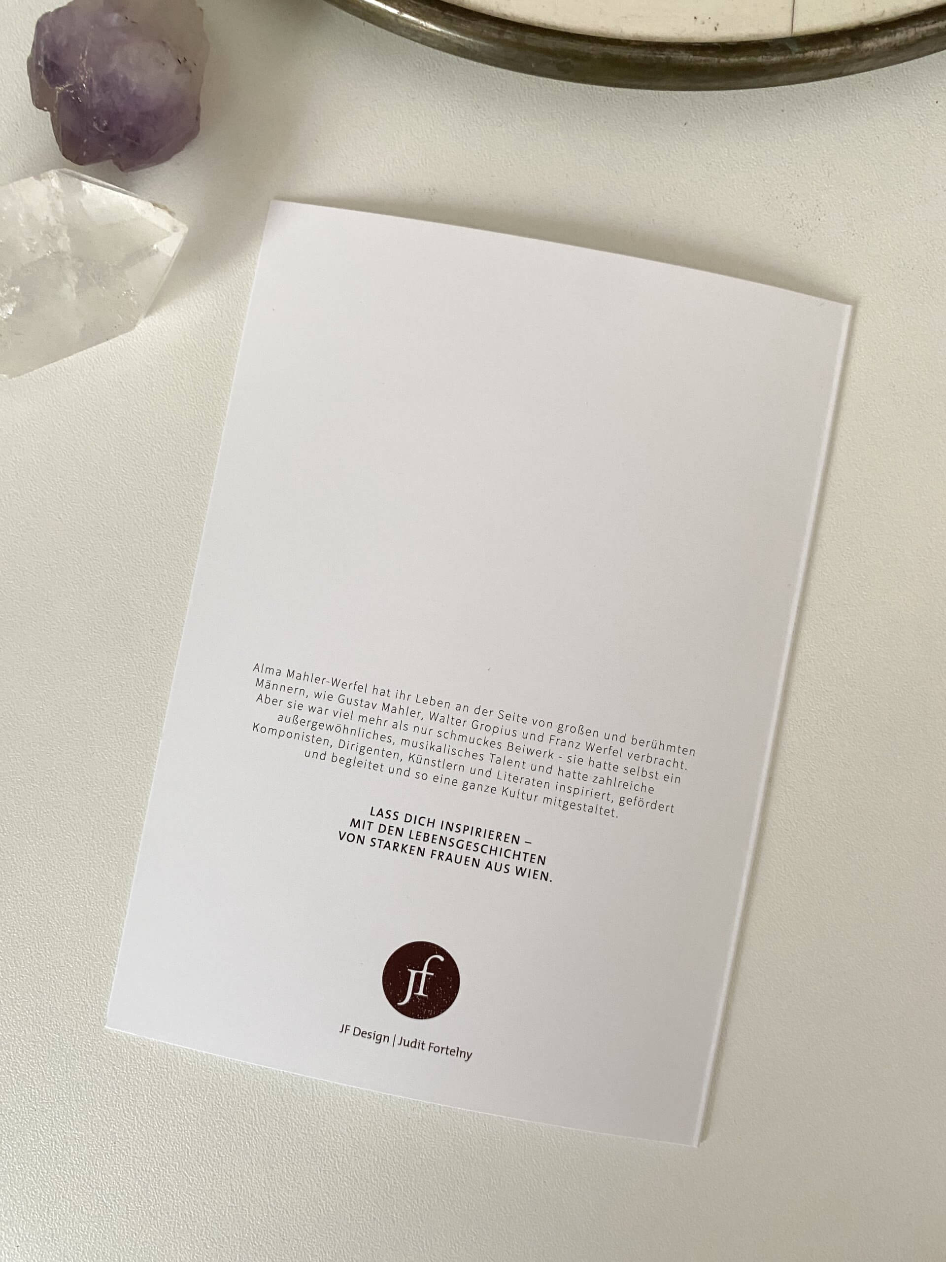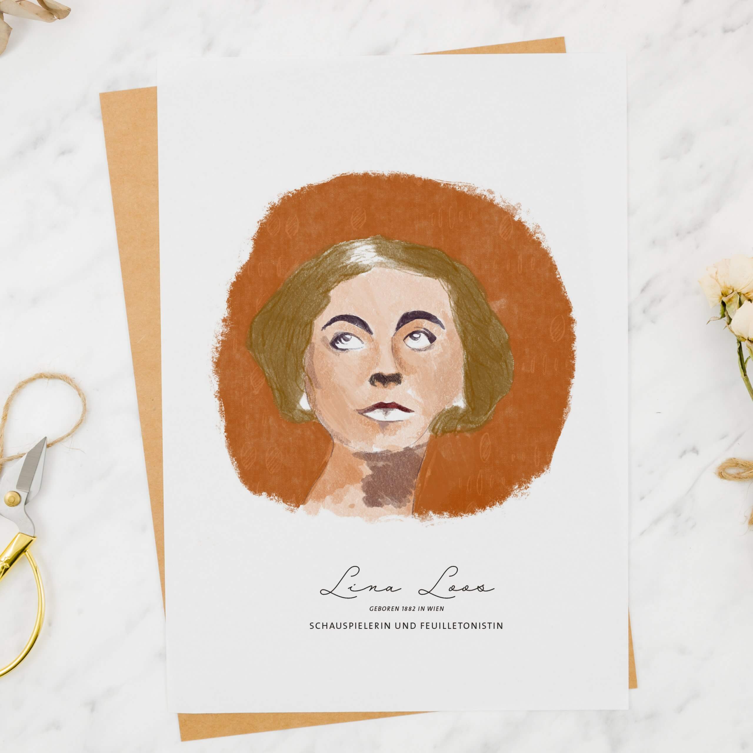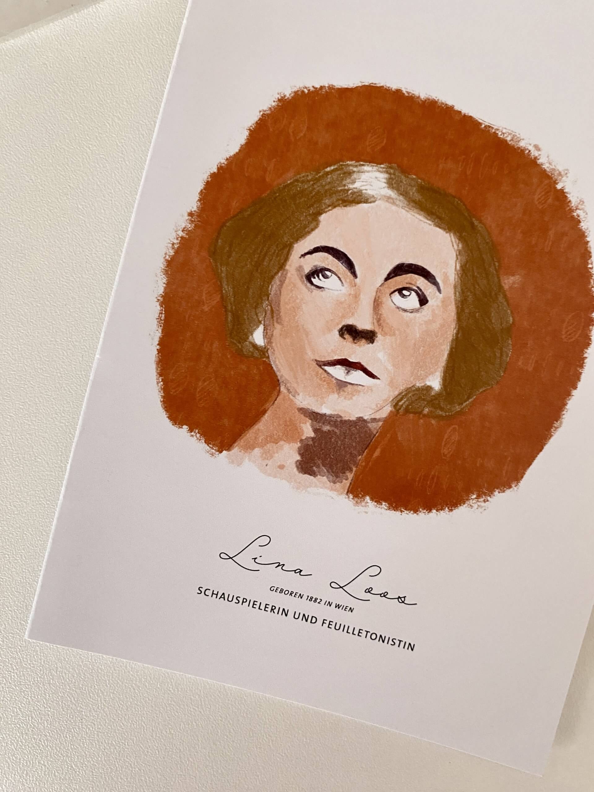 Lass dich von den Geschichten von starken Wiener Frauen inspirieren! Diese Karte zeigt ein Portrait der Schauspielerin und Feuilletonistin Lina Loos – ihre bemerkenswerte und inspirierende Lebensgeschichte ist auf der Rückseite abgedruckt.