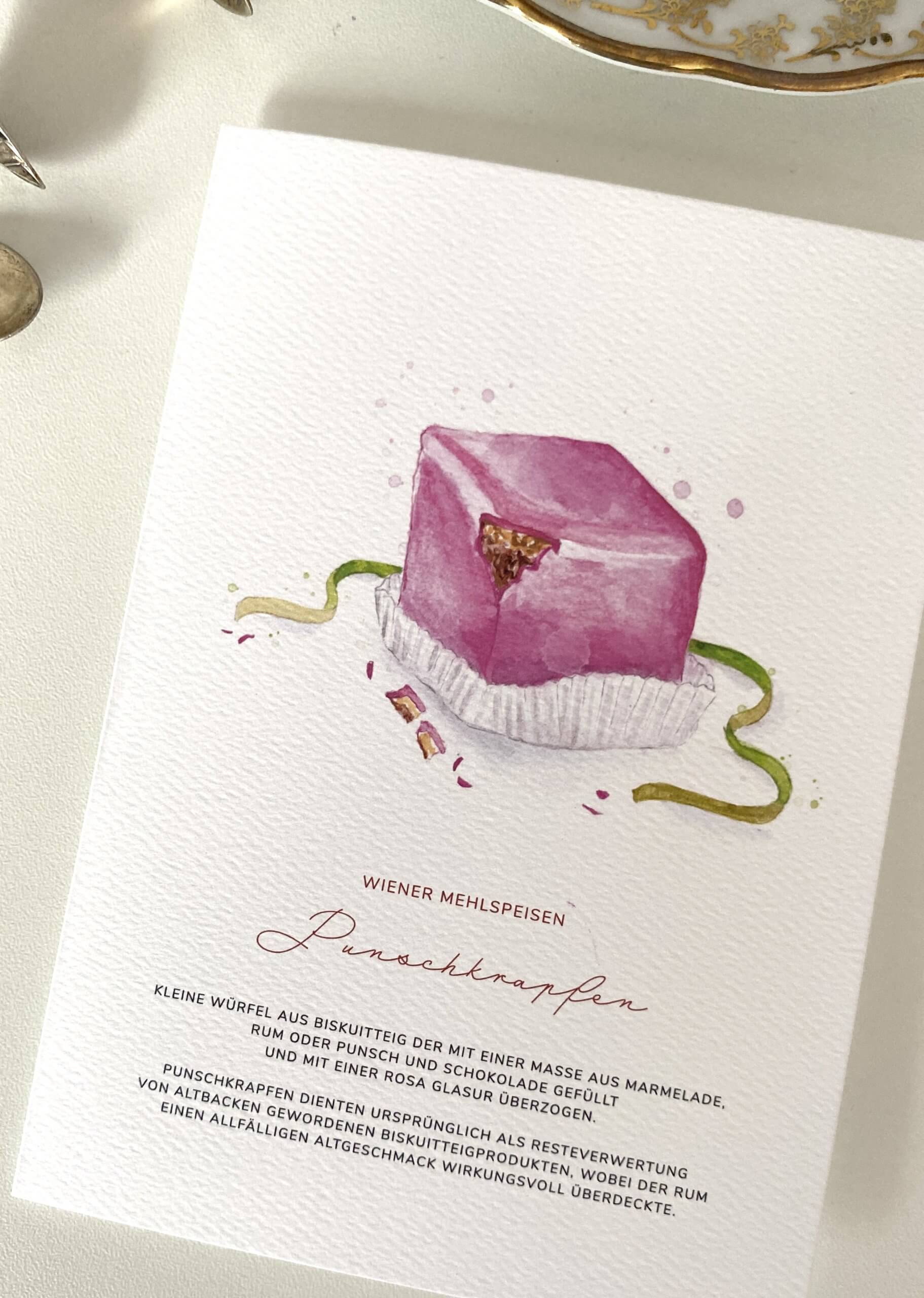 Diese Karte ist ein Druck von meinem handgezeichneten Aquarell des Punschkrapfens, die in keinem Wiener Kaffeehaus fehlen darf. Zusätzlich findet sich auf der Karte Rezeptinfos, Geschichtliches und fun facts.