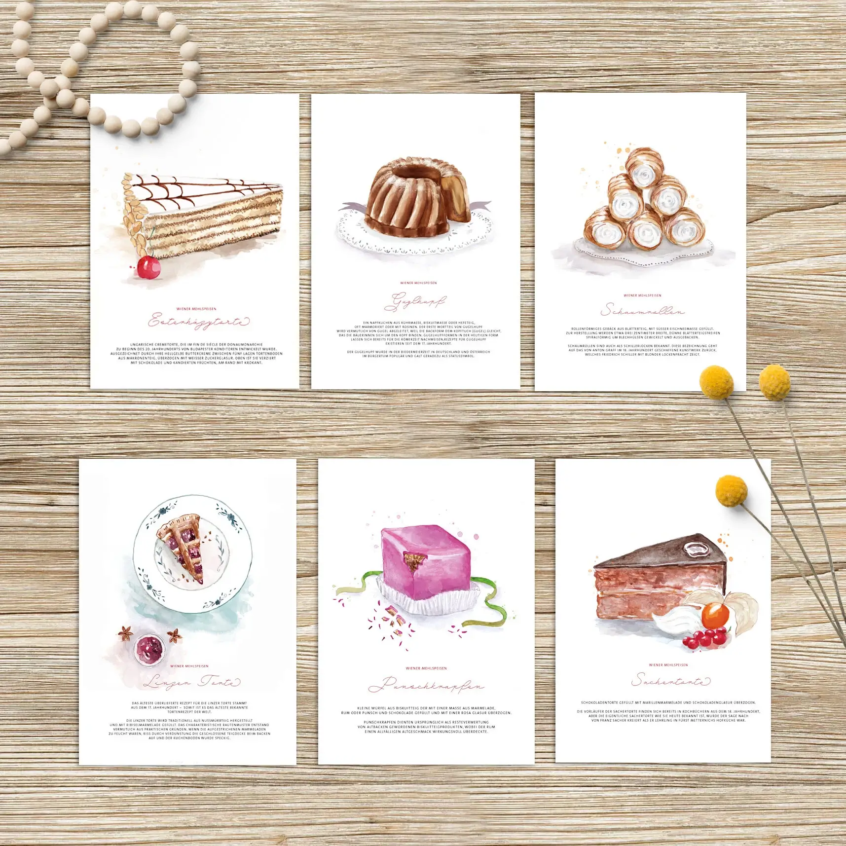 Diese Karten sind Drucke von meinen handgezeichneten Aquarellen und geben einen köstlichen Überblick über die Wiener Mehlspeisen die in keinem Kaffeehaus fehlen dürfen: Esterházytorte, Guglhupf, Schaumrollen, Linzer Torte, Punschkrapfen und Sachertorte.Zusätzlich finden sich auf den Karten Rezeptinfos, Geschichtliches und fun facts.Innen sind die Karten weiß, perfekt für eine liebevolle Nachricht.