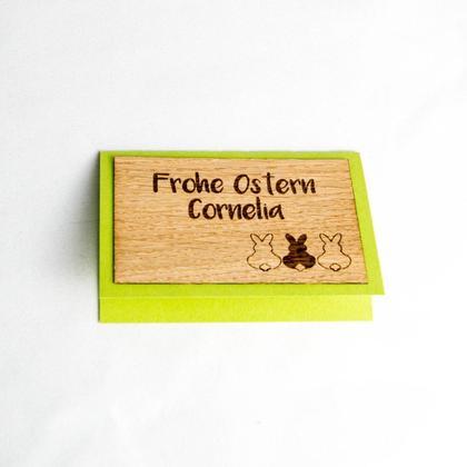 Die Holzkarte klebt auf einem hellgrünen Kraftpapier-Billett.