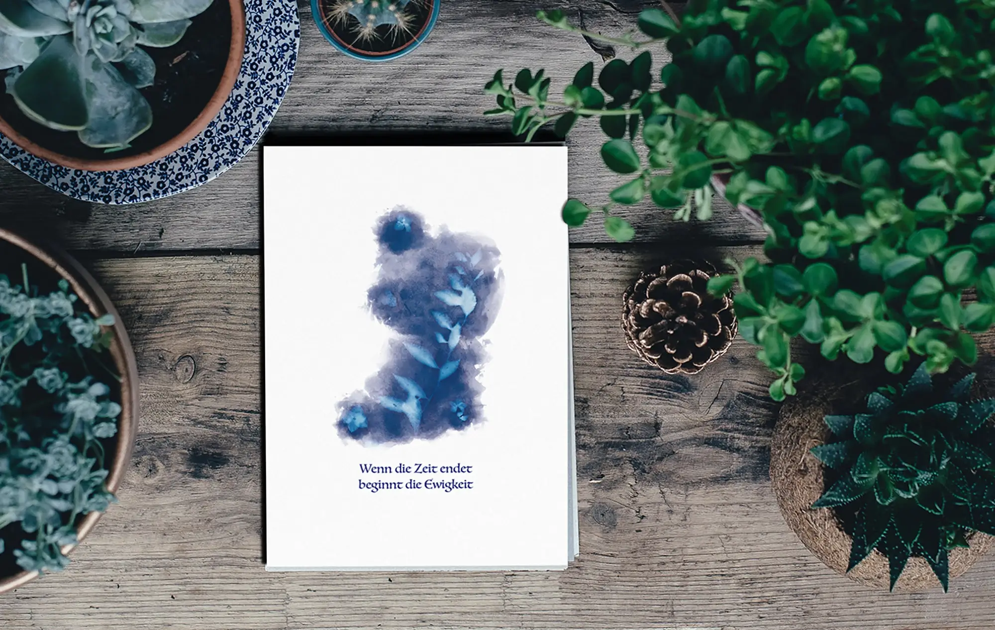 Verschicken Sie tröstende Worte und Erinnerungen an einen geliebten Menschen in einer einzigartigen und eleganten Weise mit dieser modernen Trauerkarte in Cyanotypie-Stil. Diese elegante Karte bietet innen genügend Platz für persönliche Botschaften, Gedichte oder Erinnerungen. Teilen Sie Ihre Gefühle auf eine kreative und liebevolle Weise mit denen, die Ihnen nahestehen.