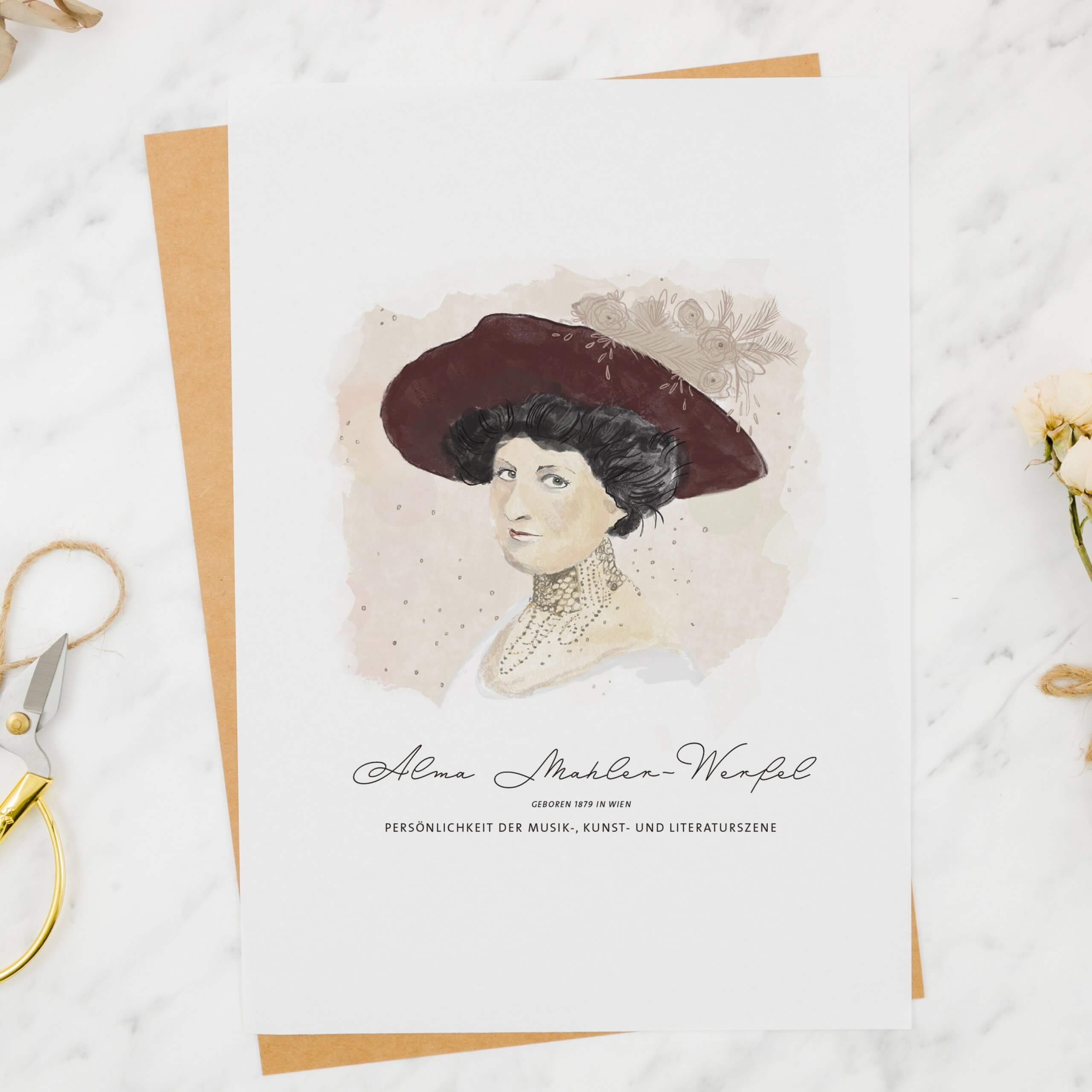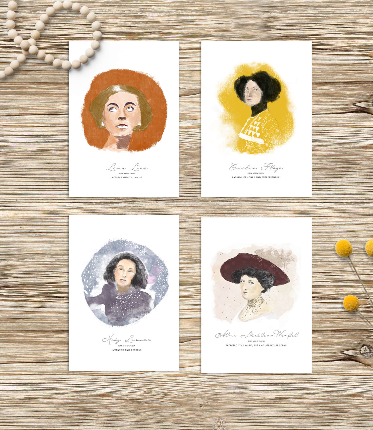 Lass dich von den Geschichten von starken Wiener Frauen inspirieren! Die Karten zeigen die Portraits der Kunst- und Kulturmäzenin Alma Mahler-Werfel, der Reform-Modedesignerin Emilie Flöge, der Erfinderin und Schauspielerin Hedy Lamarr sowie der Schauspielerin und Feuilletonistin Lina Loos – ihre bemerkenswerten und inspirierenden Geschichten sind auf der Rückseite abgedruckt.