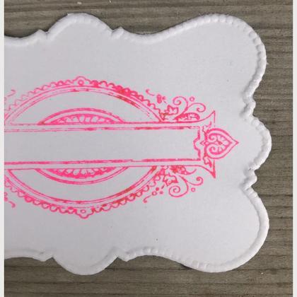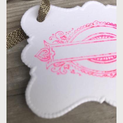 3 Stück handbedruckte Geschenksanhänger, Druck in Pink, mit einem edlen goldenen Bändchen dran, ca. 15 cm lang .
