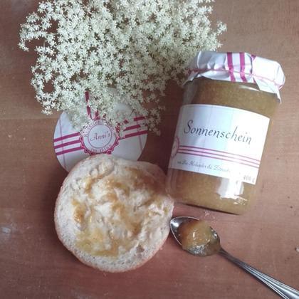 Hinter dem Sonnenschein Fruchtaufstrich steckt unsere Sommersorte, gefüllt mit Holunderblüten, Zitronen, Orangen und Limetten. Wenn Sie hier nur riechen könnten wie gut das duftet. Und so schmeckt es auch. Intensiv, frisch, fruchtig - wie die Sonne im Glas. Das ist auch der einzige Fruchtaufstrich in unserem Sortiment, der die Fruchtschalen enthält, Wird doch alles miteinander püriert und anschließend eingekocht. Daher verwenden wir nur unbehandelte Zitrusfrüchte und die unbehandelten Holunderblüten aus eigenem Anbau.