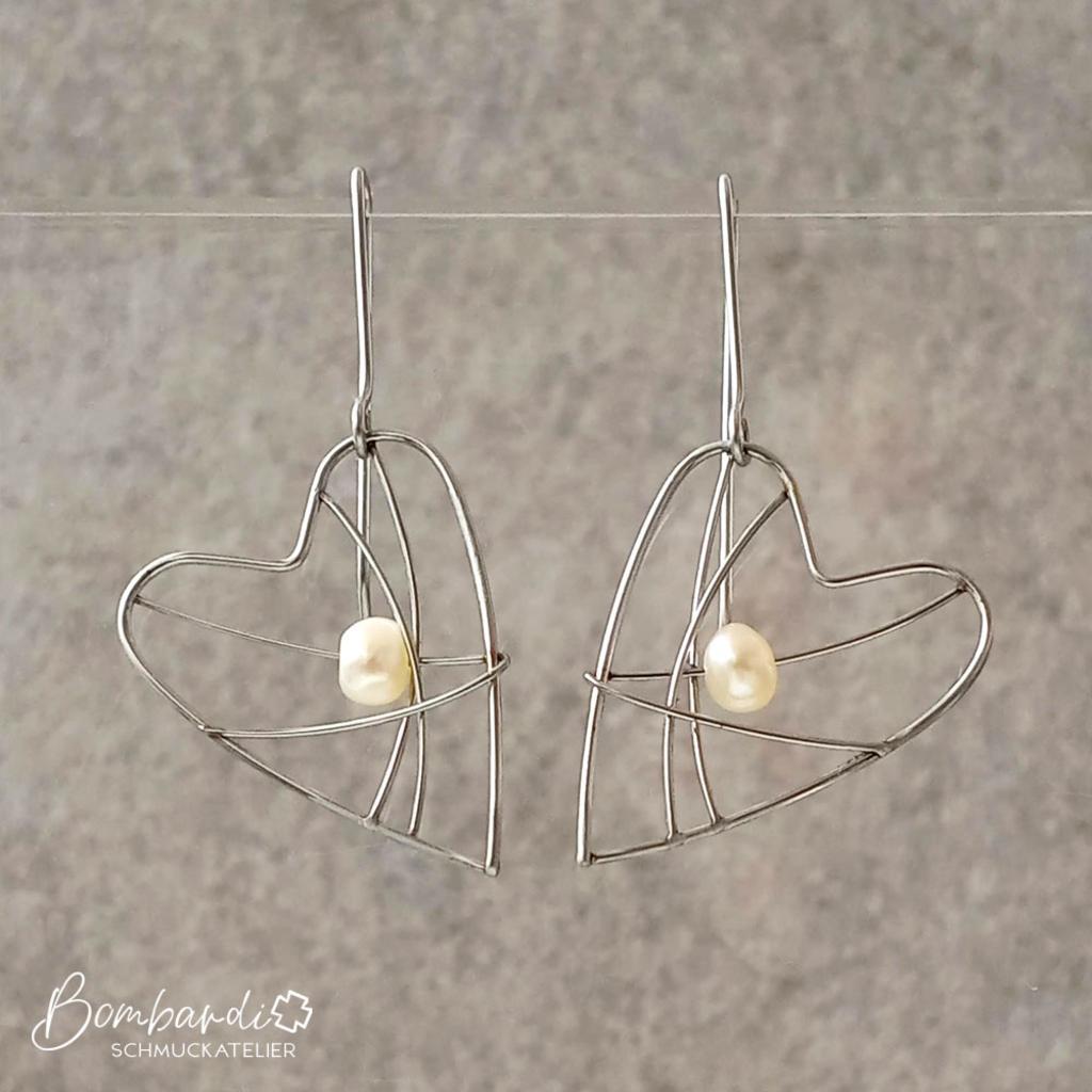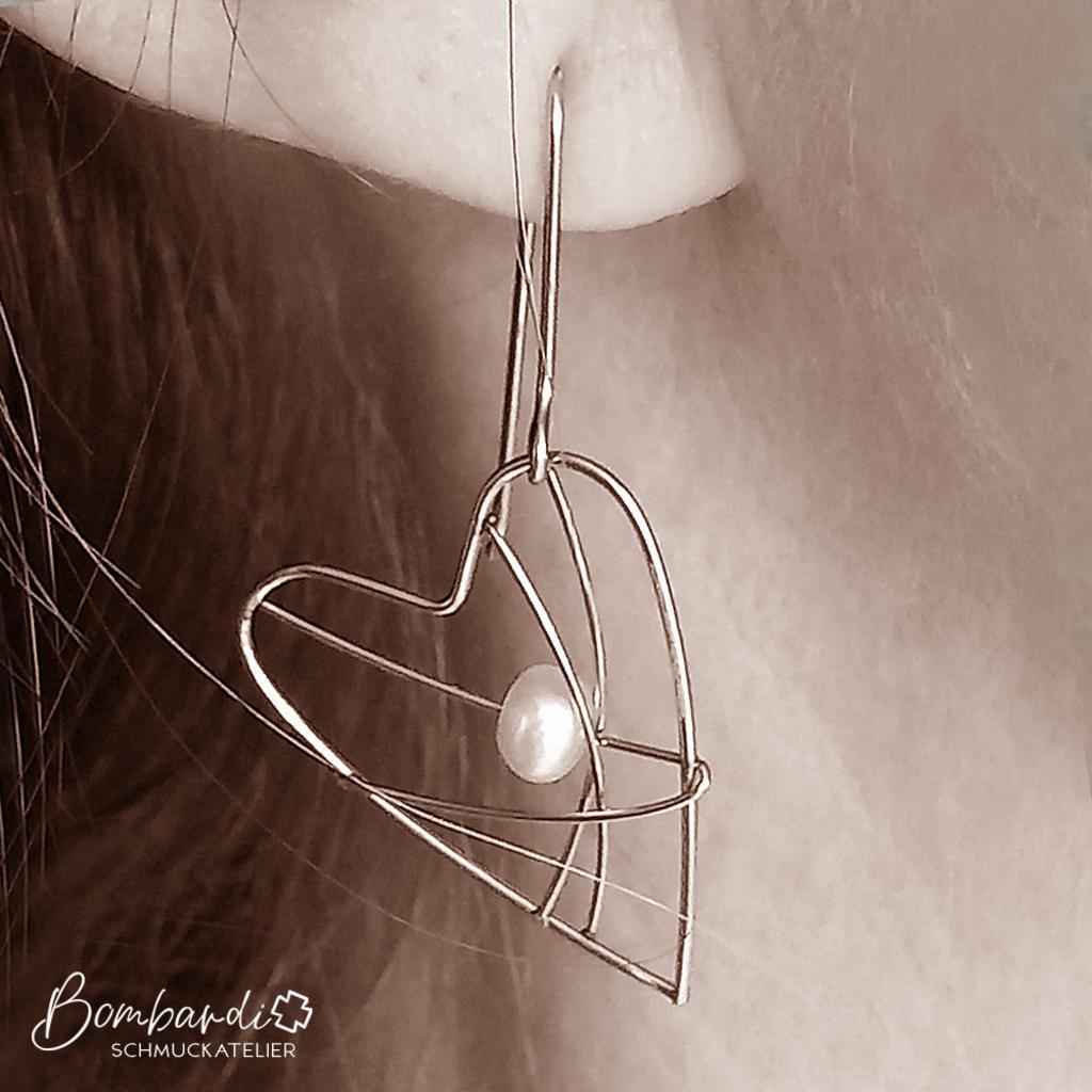 Hauchzarte Herz-Ohrpendel mit einer weißen Zuchtperle.